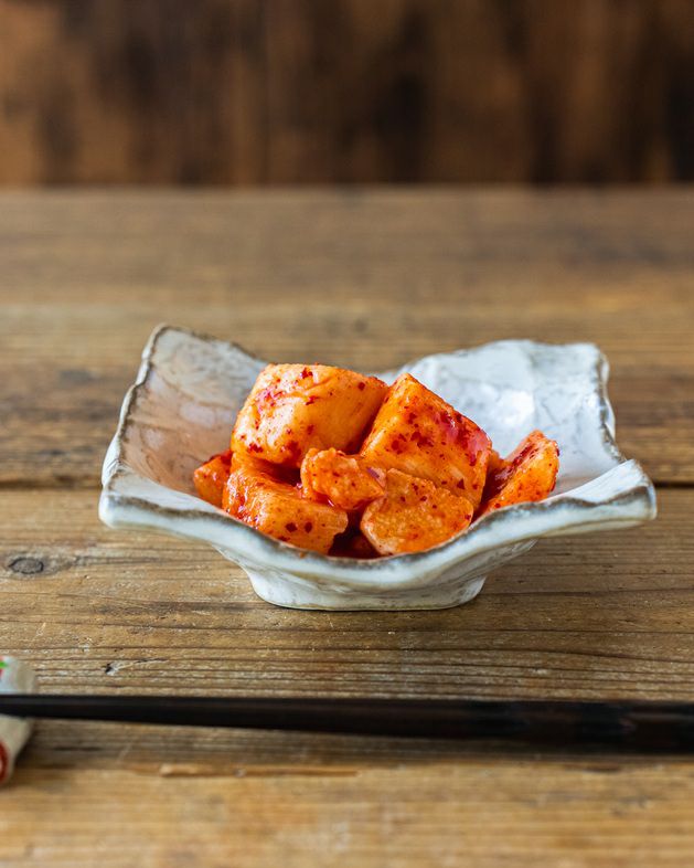 国産の長芋を使用し、食べやすいサイズに刻んだうえで、キムチ専門店の自家製ヤンニョンと出汁の旨みを効かせて仕上げた「山芋キムチ」です。 サクサクとした歯切れの良い食感と、キムチの辛味、さらに後味に広がる和風出汁の旨みが特長で、他店との差別化がしやすい業務用キムチとしてご提案できる商品です。 山芋は水分が多く、味が入りにくい食材のため、通常は業務用途での扱いが難しいとされがちですが、本商品は塩漬け工程から出汁の風味を取り入れる独自製法により、しっかりと下味を含ませています。そのため、盛り付け後も味がぼやけにくく、安定した味わいを提供できます。 口に入れた瞬間は唐辛子の辛味とにんにく・生姜の香味が立ち、後味には出汁のやさしい旨みが残ります。お客様からは「和風キムチ」「食べやすいキムチ」といった評価も多く、キムチが得意でない層にも受け入れられやすい味設計です。 【業務用としてのおすすめポイント】 ・下処理不要でそのまま使用可能 ・和風出汁仕立てで和食・居酒屋メニューに相性抜群 ・サクサク食感で提供後の食感劣化が少ない ・辛味が強すぎず、幅広い客層に対応 ・小鉢・前菜・箸休めとして原価調整しやすい 【おすすめ使用シーン・メニュー例】 ・居酒屋・焼肉店の小鉢、付き出し ・定食屋の副菜・日替わり惣菜 ・和食店の箸休め、前菜 ・ランチセットの付け合わせ ・ビール・ハイボールなどの酒肴 出汁の効いた和風キムチのため、ご飯との相性が非常に良く、定食メニューや丼物の添え物としても活躍します。また、さっぱりとした後味のため、脂の多い料理との組み合わせにも最適です。 「いつものキムチでは物足りない」「他店と違う一品を加えたい」 そんな飲食店様にこそ、ぜひお使いいただきたい山芋キムチです。 業務用ならではの安定感と使い勝手の良さを、ぜひ一度ご確認ください。