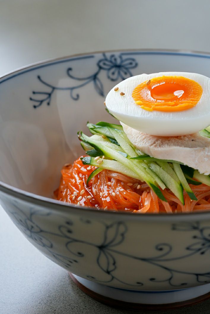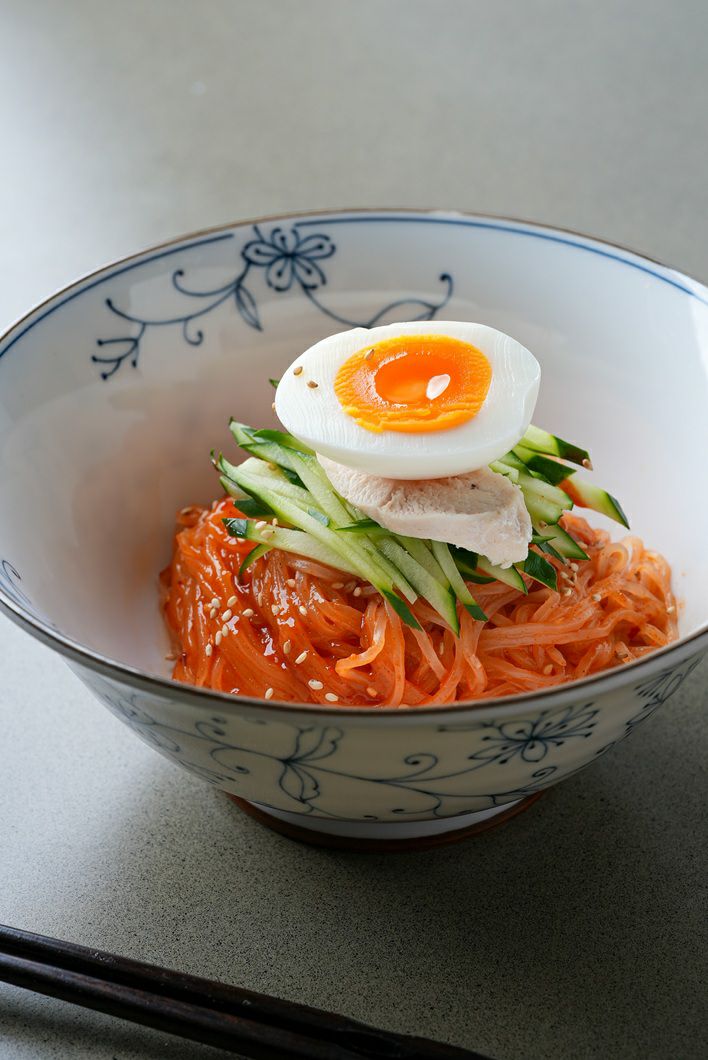 ピビン麺は、韓国冷麺と同じく茹でた麺をしっかり冷やし、特製の調味料と混ぜて食べる韓国の冷たい麺料理です。最大の特長は、スープがないこと。そして、コチュジャンをベースにした調味で仕上げるため、冷麺よりも辛味とコクがしっかり感じられる点にあります。