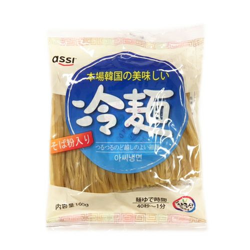 そば粉の風味豊かな半生タイプの冷麺です。ツルツルとしたのどごしの良さをお楽しみください。別売りのアッシ冷麺スープと共にどうぞ。焼肉のシメには韓国冷麺が最適!細麺に牛骨ベースのコクとすっきりとした酸味があるスープがよく絡んで季節を問わず美味しくお召し上がり頂けます。