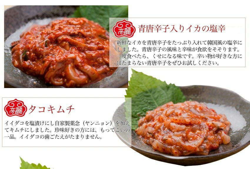 「忙しい毎日の、小さなご褒美に」 賞味期限は最短の「明太子チャンジャ」でも14日間。急いで食べる必要はありません。 今夜はビールに合わせてイカを、明日は白米と一緒にチャンジャを……。 全国どこでも送料無料でお届けします。
