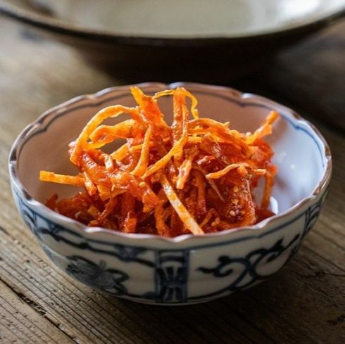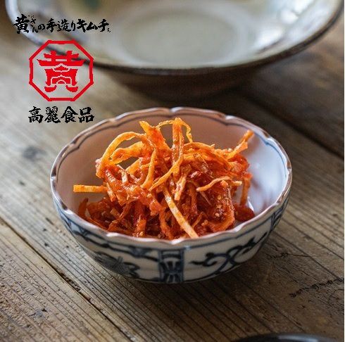 甘辛いヤンニョンとするめの風味が人気のスルメキムチに、白身魚の風味と食感が特徴の焼きカマを混ぜ込みました。ちなみに、焼きカマとは白身魚のすり身を薄く伸ばし、焼き上げたおつまみです。