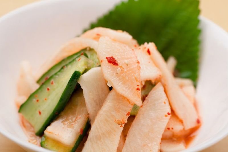 大根と胡瓜をスライスし、甘酢風味に漬けた爽やかな口あたりのキムチです。甘酢漬けと風味がとても美味しい一品で、冷麺の具材にピッタリの相性なので「冷麺専用キムチ」と呼んでいます。 もちろん、そのまま食べても美味しいですし、冷麺を作る時には是非にも載せてほしいキムチです。