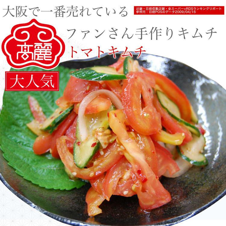 トマトをスライスして甘酸っぱ辛く味付けしたキムチです。 玉ねぎ、胡瓜と合わせて、こだわりの唐辛子で作った生ヤンニョンジャンをベースに、醤油、酢、砂糖で味を調えています。 トマトと胡瓜、玉ねぎの味とヤンニョンの甘み、酸味、辛味が絡まって最高の美味しさを醸し出しています。甘めの味つけですが酢の酸味があっさりしていて、胡瓜や玉ねぎも入っているので、サラダとして食べらるおススメのキムチです。冷麺を作る時に汁ごと入れると美味しさが増すので、おススメしています♪