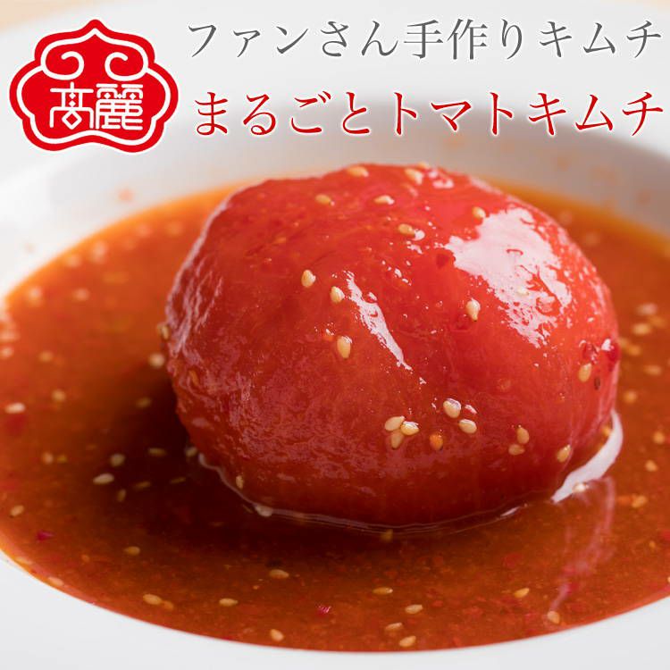 丸ごとトマトのキムチ【1個】トマト1個を丸ごとキムチにしちゃいました。冷やしても、そのままでお召し上がりいただけます。サラダやスープにアレンジしてもとってもおいしい。さっぱりしたキムチです。丁寧に一つずつ湯向きしているので、キムチの汁が美味しいドレッシングになります♪ また、この汁を素麺や冷麺にあえていただくとピビン麺風の味になりますので、これもおススメですよ~!!