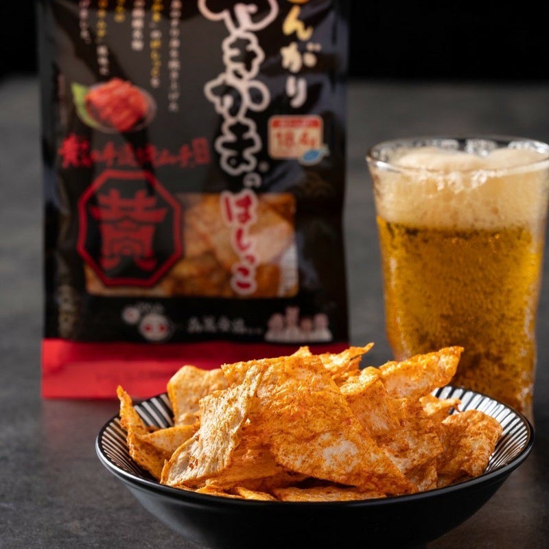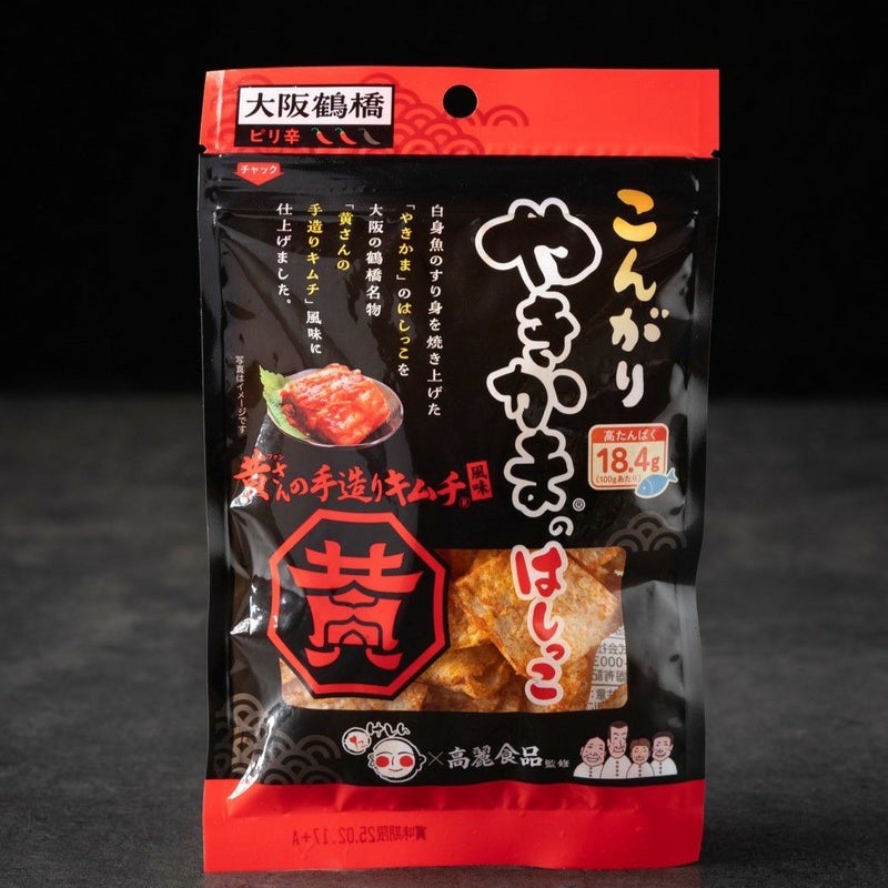 「白身魚のすりみを薄く伸ばしてこんがり焼き上げたやきかまのはしっこ」 おつまみとして美味しいやきかまで黄さんのキムチ味を作ってもらいました! やきかまの歯応えと旨辛の濃い味付けは、ビールとの相性抜群! 食べ切りサイズなので、新幹線の車内やご自宅での晩酌に最適です。 是非、一度ご賞味ください。