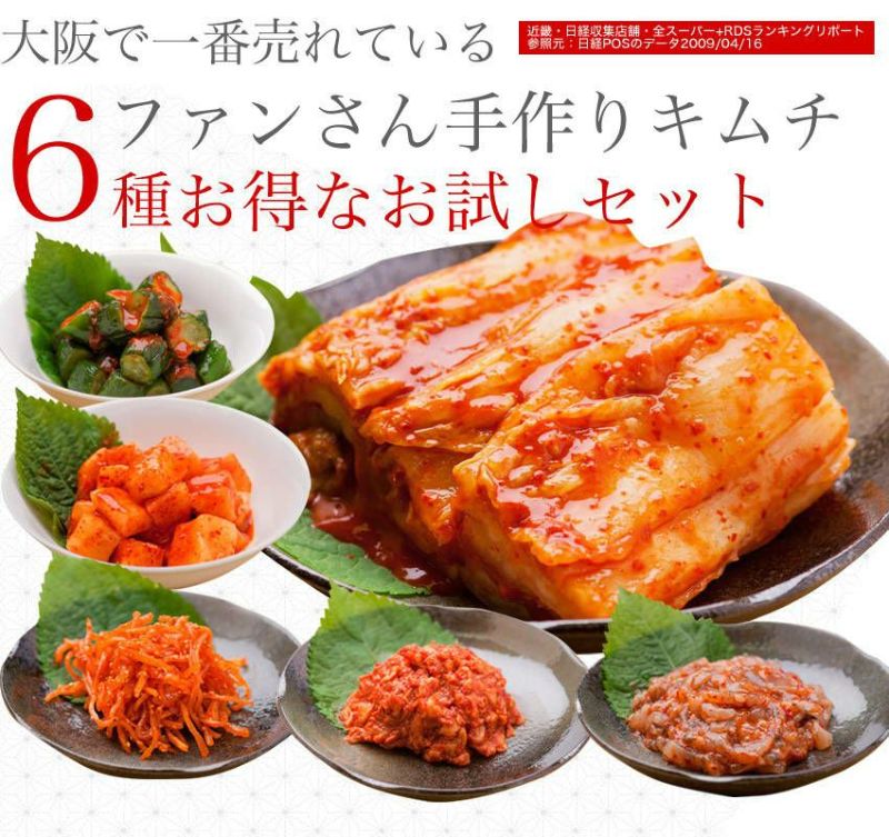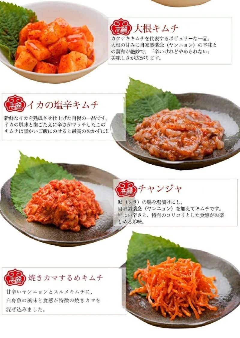 大阪で一番売れているキムチ屋やさん「高麗食品」のさまざまなキムチ6種を詰め合わせにいたしました。こだわりの味をたっぷりとご堪能してください。 【白菜キムチ】200g 【大根キムチ】200g 【胡瓜キムチ】200g 【イカの塩辛キムチ】100g 【チャンジャ】80g 【焼きカマするめキムチ】60g
