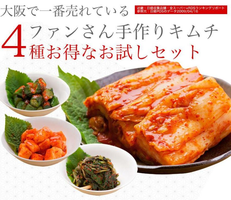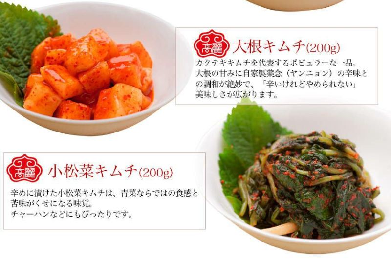 大阪でキムチ屋はじめて50年。「高麗食品」のさまざまなキムチ4種を詰め合わせにいたしました。こだわりの味をたっぷりとご堪能してください。